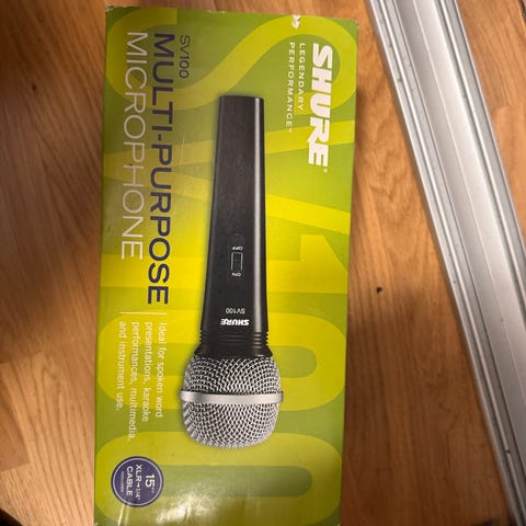 Shure SM58 mikrofon inklusive användarguide, mikrofonfodral och tillbehör. Mikrofonen är en dynamisk modell som ofta används för sång och tal. Produkten levereras med originalförpackning och tillbehör för förvaring och användning.
