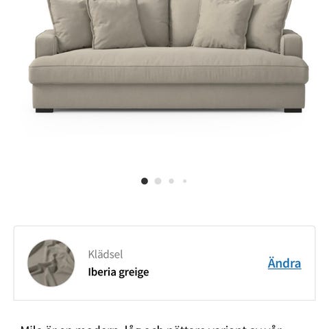 Mio soffa med tillhörande pall i beige färg. Soffan har en enkel design med två ryggkuddar och armstöd på båda sidor. Pallens sittdyna är klädd i samma beige tyg som soffan. Möbelsetet är lämpligt för vardagsrum och erbjuder sittplats för flera personer.