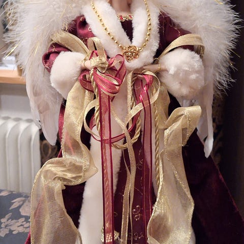 Ängel som kan användas som toppstjärna på granen el bara stå på en hylla. Sista bilden visar tratt av plast som stadgar upp den. Ca 32cm hög.