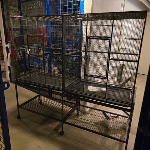 Passar fint för antingen fågel eller gnagare. 2 mindre luckor samt en stor lucka på ovansidan av buren. 2 hyllplan medföljer. Buren går inte att fälla ihop! Rejäl och stadig! Helt okej skick.