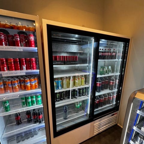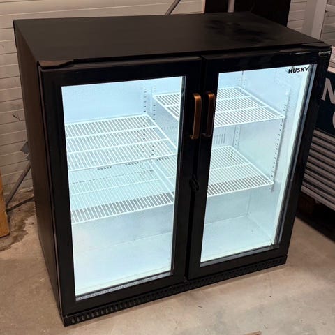Kylskåp med glasdörrar och svart ram. Utrustad med två dörrar och flera hyllor för förvaring av drycker eller livsmedel. Passar för kommersiellt eller privat bruk där synlighet av innehållet önskas.