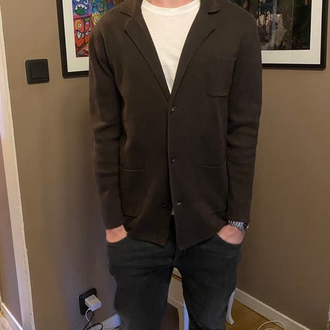 Rocobarocco Jacka i brun färg, tillverkad i läder. Herrstorlek L, går som 54 närmast. Jackan har en insida med mönstrat foder och flera innerfickor. Passar som ytterplagg för herrar.