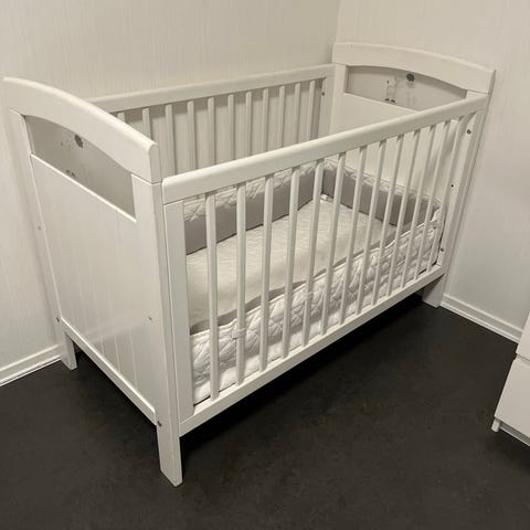 En spjälsäng i trä med fin bäddmadrass av naturmaterial. Inga fläckar och fint skick på madrassen. Följer även med spjällskydd, lakan mm.