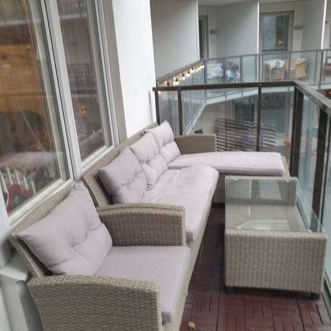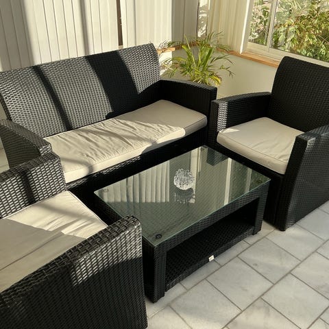 Säljes pga flytt. Sparsamt använda och mycket fina balkongmöbler (inkl bord) i brunt rotting. Dynorna går att tvätta om så önskas. Djur och rökfritt hem.