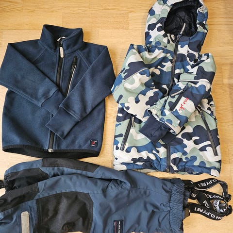 Vindfleece, jacka och byxor från Polarn och pyret. Använda av ett barn under hösten, fint skick. Vindfleecen och skalkläderna har samma system och kan klickas ihop.
