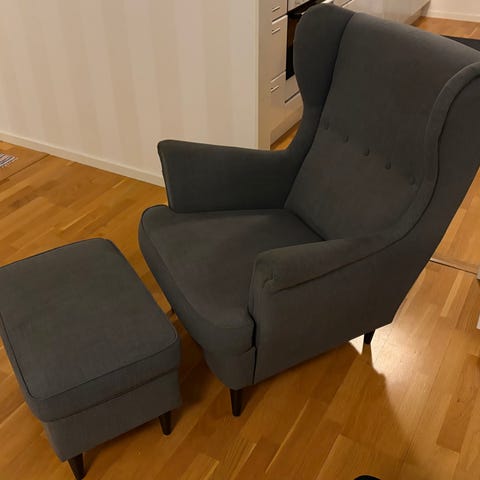 Fåtölj och fotpall som köptes för ett år sedan. Har använts mycket sparsamt. Säljes på grund av att vi ska göra om till barnrum. Nypris 2594:-