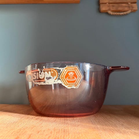 Set bestående av en gryta med glaslock, en stekpanna och en värmefördelare i beige färg. Grytan och stekpannan har en marmorliknande yta som är lätt att rengöra. Glaslocket har ett handtag i metall. Värmefördelaren är rund med perforerad yta för jämn värmefördelning på spisen.