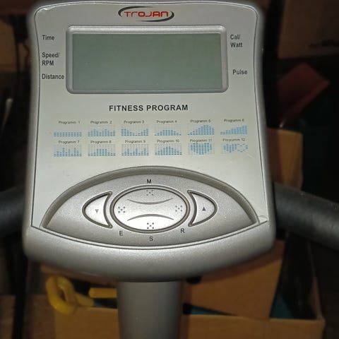 Träningscykel utrustad med digital display för tid, hastighet, distans, puls och kaloriförbrukning. Justerbar sitthöjd sadel och ställbart motstånd.