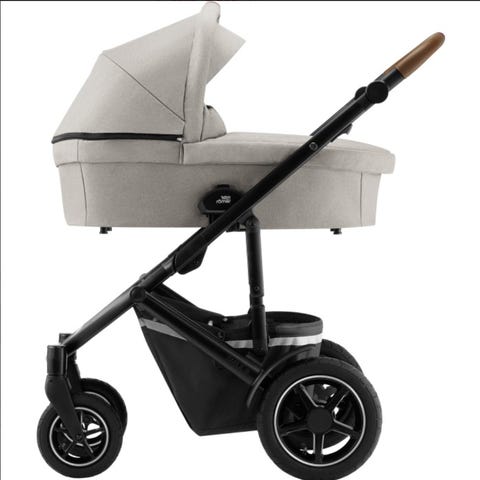 Har även tillhörande madrass till liggdelen, skötväska, regnskydd mm.