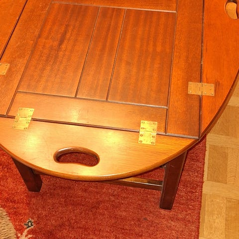 Träbrickbord med ovalt bordsskiva och handtag på sidorna. Bordet har gångjärn som möjliggör att bordsskivan kan fällas ihop eller ändra form. Passar för användning som brickbord, sidobord eller soffbord.