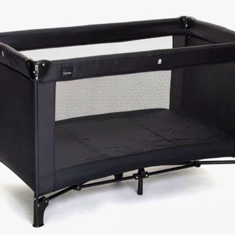 Carena resesäng i svart färg. Praktisk och portabel sänglösning för barn, enkel att fälla ihop och transportera. Sängen har nätpaneler på sidorna för ventilation och överblick. Passar för resor och tillfälliga sovplatser.