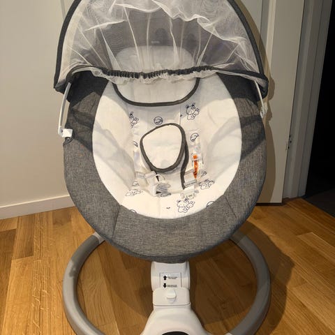Nyskick men saknar babymobilen som hänger ovanför. Har 5 gunglägen, och 4 olika lugnande ljudlägen, kan användas med Bluetooth.