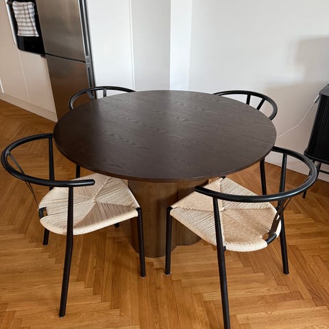 Hej, säljer detta fina matbord Adele från Sleepo. 130cm diameter, vi har bara packat upp det och insett att vi behöver ett lite större bord. Vi har precis sålt av lite stolar men vi fick plats med 6 stolar runt bordet i färdigställt bord. Sitter man och äter när stolarna inte är inknuffade lika långt kunde man lätt sitta 7 personer runt bordet. Så fint, stabilt och robust bord med finishen Valnöt, bordet känns lyxigt och är i väldigt bra kvalitet. Helt oanvänt, endast uppställt för känsla och foto.