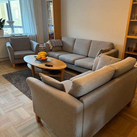 Grå stilren tygsoffgrupp från MIO, inköpt 2015.