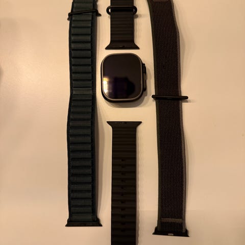 Apple Övriga mobiltillbehör. Innehåller en smartklocka med flera utbytbara armband i olika material och färger. Köpt augusti 2024. Knappt använt!