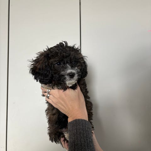 Mamman är en svart och vit cockerpoo som väger 9,5 kg och är 42 cm hög.