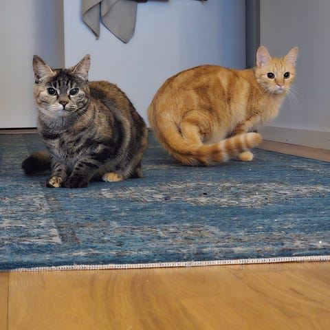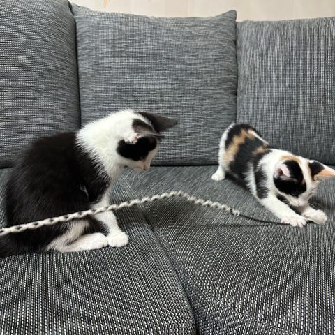 Po (sköldpadsfärgd tjej) och Emmitt (grå o vit kille) söker sin helt egen familj att gosa med ❤️ Po är väldigt framåt, nyfiken o lekfull (hon älskar att "spela boll" med vår sön🤣) vart Emmitt är lite lugnare o gosig. Dom är växt upp inomhus m sin mamma, moster, 5 hundar o 4 tvåbenta, så dom är vana vid liv o rörelse 😘