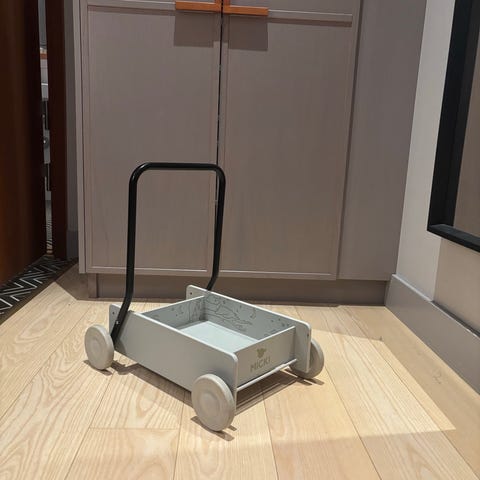 Mickis klassiska lära-gå-vagn i trä. Vagnen ger ett stabilt och säkert stöd vid barnets första steg och har bromsbara hjul samt ställbart handtag.