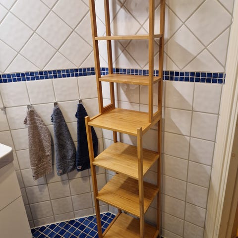 Hyllor i bambu perfekta för badrummet. Alla tre i gott skick. En hög och två låga.