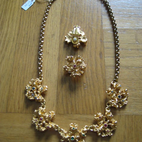 Jättevackert halsband guldfärgat med präglade bladformer och en grön glas-sten. Till halsbandet hör vackra matchande clips örhängen.