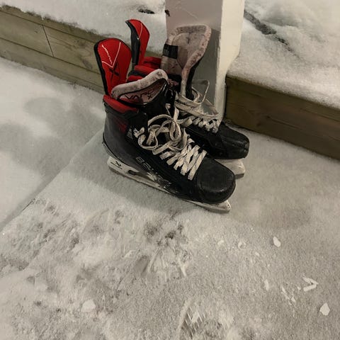 Bauer Vapor ishockeyskridskor i storlek 42. Skridskorna är designade för ishockey och har en svart färg med röda och vita detaljer.