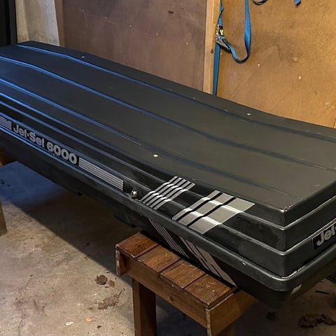 Takbox i grå färg med lås och två nycklar. Takboxen har skador på ena hörnet, vilket syns på bild. Passar för transport av bagage och annan utrustning på bilens tak. Perfekt för skidor!