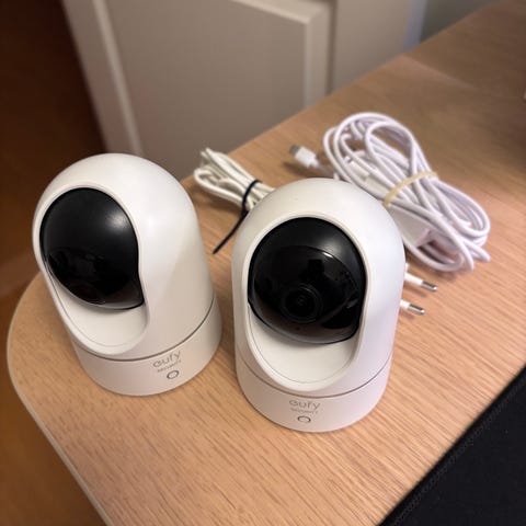 Eufy Home Base 2 med tillhörande strömadapter och LAN-kabel.