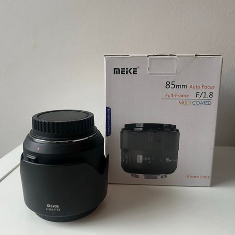 Säljer ett 85mm objektiv från Meike med F/1.8 och autofokus. Objektivet kommer med ett linsskydd, baklock och ett motljusskydd i toppskick.