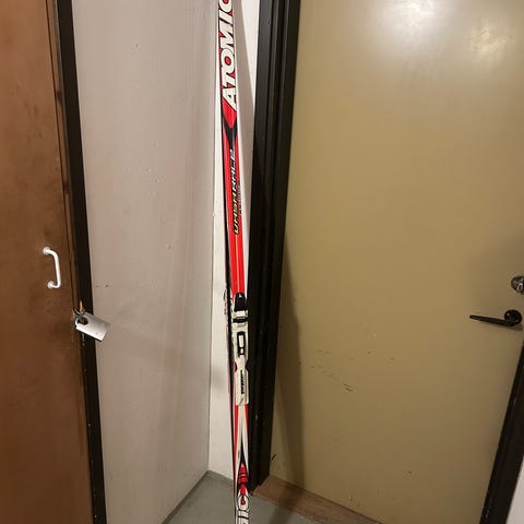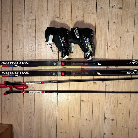 Använda längdskidor med pjäxor i äkta skin nr43 och stavar.