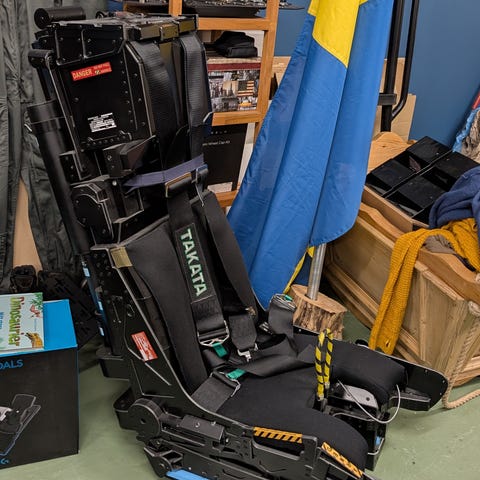 Simulatorn har byggts och använts på en gymnasieskola, finns märken från användning och växelspaken saknar sin damask.