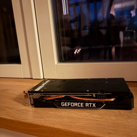 NVIDIA GeForce RTX 2060 grafikkort med en fläkt för kylning. Grafikkortet är svart och har en PCIe-anslutning. Den är från min prebuilt så jag har ingen låda till den.