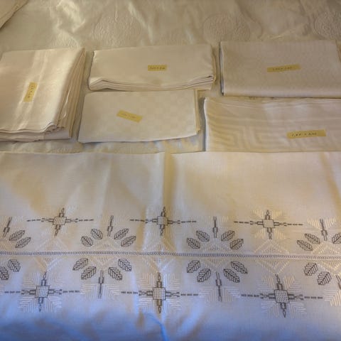 Handbroderad linnetabletter i antikvit färg med blå broderade detaljer. 6 stycken Passar för elegant dukning.