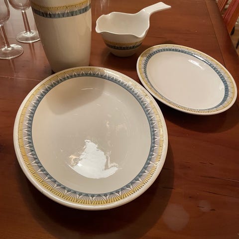 Rörstrand kastrull med lock i keramiskt material. Produkten har två handtag och en rund form. Färgen är beige med blå detaljer. Passar för matlagning och servering.