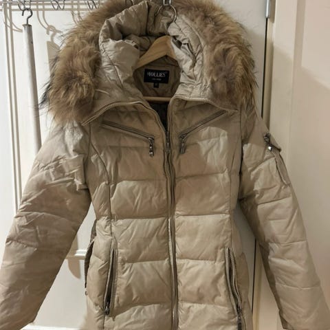 Säljer en exklusiv Hollies dunjacka i elegant beige färg med päls på huvan.