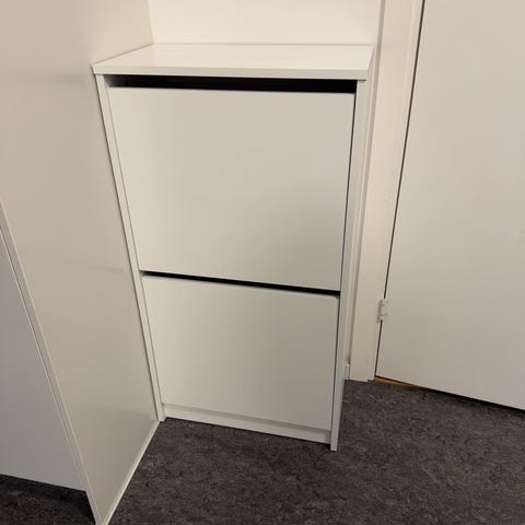 IKEA skoskåp i vitt med flera fack för förvaring av skor. Skåpet har en kompakt design med lutande dörrar som öppnas nedåt för enkel åtkomst. Passar för hall eller andra utrymmen där skoförvaring behövs.