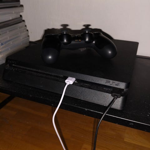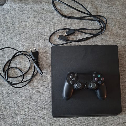 Sony Playstation 4 spelkonsol i svart färg. Konsolen är avsedd för spel och underhållning på TV och har flera USB-portar för anslutning av tillbehör. Handkontroll medföljer i blå färg.