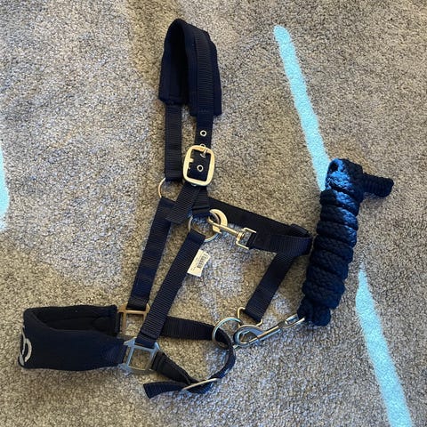 En röd grimma i storlek ponny med tillhörande grimskaft. Både grimman och grimskaftet har använts men har få tecken på det. Alla delar och spännen fungerar helt som de ska.