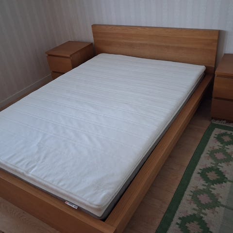 Ikea Malm säng + madrasser + Malm nattduksbord. Bäddmaddrassen är av memory foam, lite tjockare och fast (hård). Allt köptes på Ikea för ca 4 år sedan. Madrasserna är i bra skick, själva ramen har små repor här och var efter flera flyttningar, samma gäller nattduksbordet