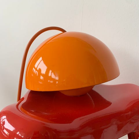Vintage Bumling taklampa i orange färg från Ateljé Lyktan. Lampan har en rund form med en diameter på 60 cm och är tillverkad i metall. Den är avsedd för takmontering och har en maxeffekt på 60W. Rastret är original och tittar man noga är det lagat i piggarna som håller det på plats. Syns dock väldigt lite när den används och vill man kan man köpa ett nytt raster via tillverkaren. Själva lampan i mycket gott skick trots att den är av en tidig modell och har en härlig retrokänsla.