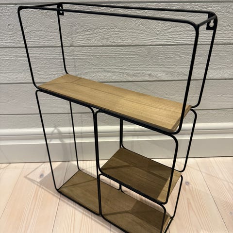 Hylla i trä med fyra grå hyllplan. Hyllan har en öppen konstruktion med två triangelformade gavlar som stöd. Passar för förvaring och organisering i olika rum.