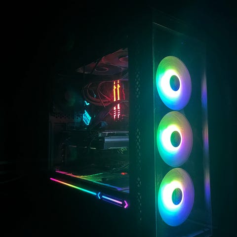 Acer Predator stationär dator med svart chassi och röd LED-belysning. Designad för prestanda med avancerade funktioner för spel och krävande applikationer.