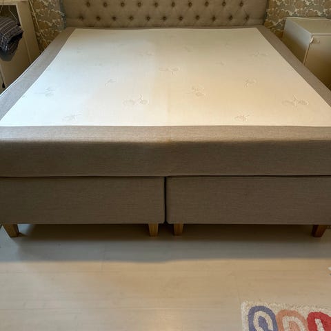 Mio sängram i trä med vit färg. Passar som en dubbelsäng och är avsedd för sovrum. Sängramen har ett klassiskt utseende med ribbad huvudgavel och fotgavel. Seng 180x200cm med rammemadrass samt sangbord, overlast och gardiner. Selger alt for kr 5000,-