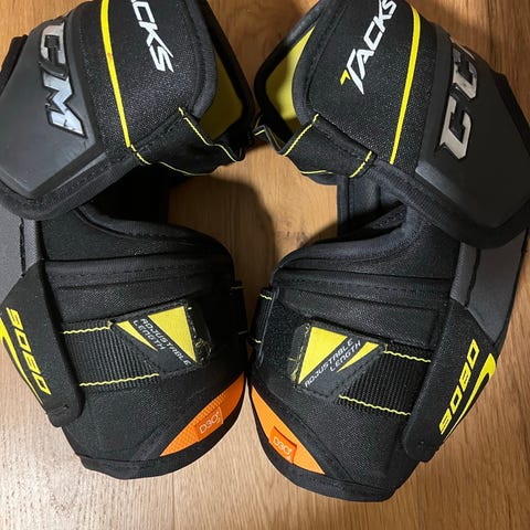 CCM 9060 ishockeyskridskor i storlek Large. Skridskorna är avsedda för ishockey och har en blå färg med detaljer i svart och gult. De är utrustade med snörning och vaddering för komfort och stöd.