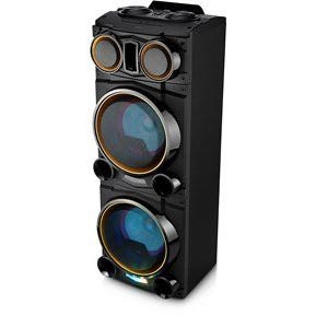 Sony MHC-V11 ljudsystem med flera funktioner för ljuduppspelning. Enheten är svart och har anslutningar för USB, FM-antenn och audio-in. Den har olika kontrollknappar för uppspelning, volym och inspelning. Modellen är utrustad med en stor högtalare och flera mindre högtalare för ljudåtergivning.