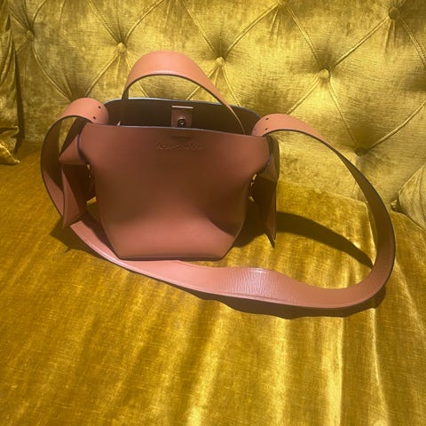 Acne Studios axelremsväska i rött läder för kvinna. Väskan har en kompakt design med handtag och avtagbar axelrem. Den är utrustad med dekorativa detaljer och metallbeslag.