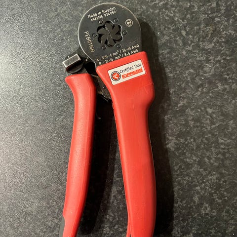 Click 'n' Crimp verktyg för kabelskor med utbytbara käftar. Verktyget har handtag med rött och svart greppmaterial för bättre hantering. Används för att pressa kabelskor och anslutningar med precision.
