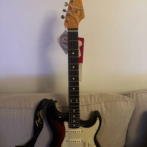 Säljer en påkostad Fender Stratocaster México 2016 elgitarr med sunburst-finish som har blivit relicad (heavy relic).