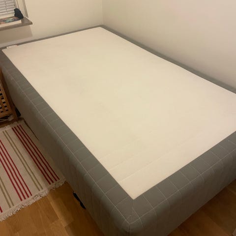 IKEA säng med grått överdrag. Sängen är placerad i ett rum med enkel inredning och har en neutral färg som passar olika miljöer.