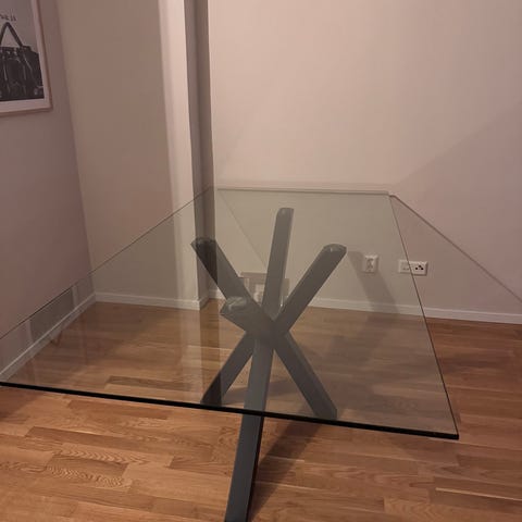 Exklusivt designat köksbord i riktigt bra kvalitet. Mycket robust och stadig konstruktion i kraftigt stål-underrede och tjock glasskiva i säkerhetsglas. Använt men i gott skick.