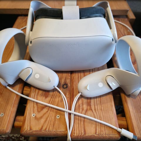 Oculus Quest 2 VR-headset med två trådlösa kontroller. Headsetet är vitt och har justerbara remmar för huvudpassform. Inga skador eller skavanker, allt funkar fint. Ca 3-4 år gammalt, men rätt lite använt. Finns i Enskededalen.